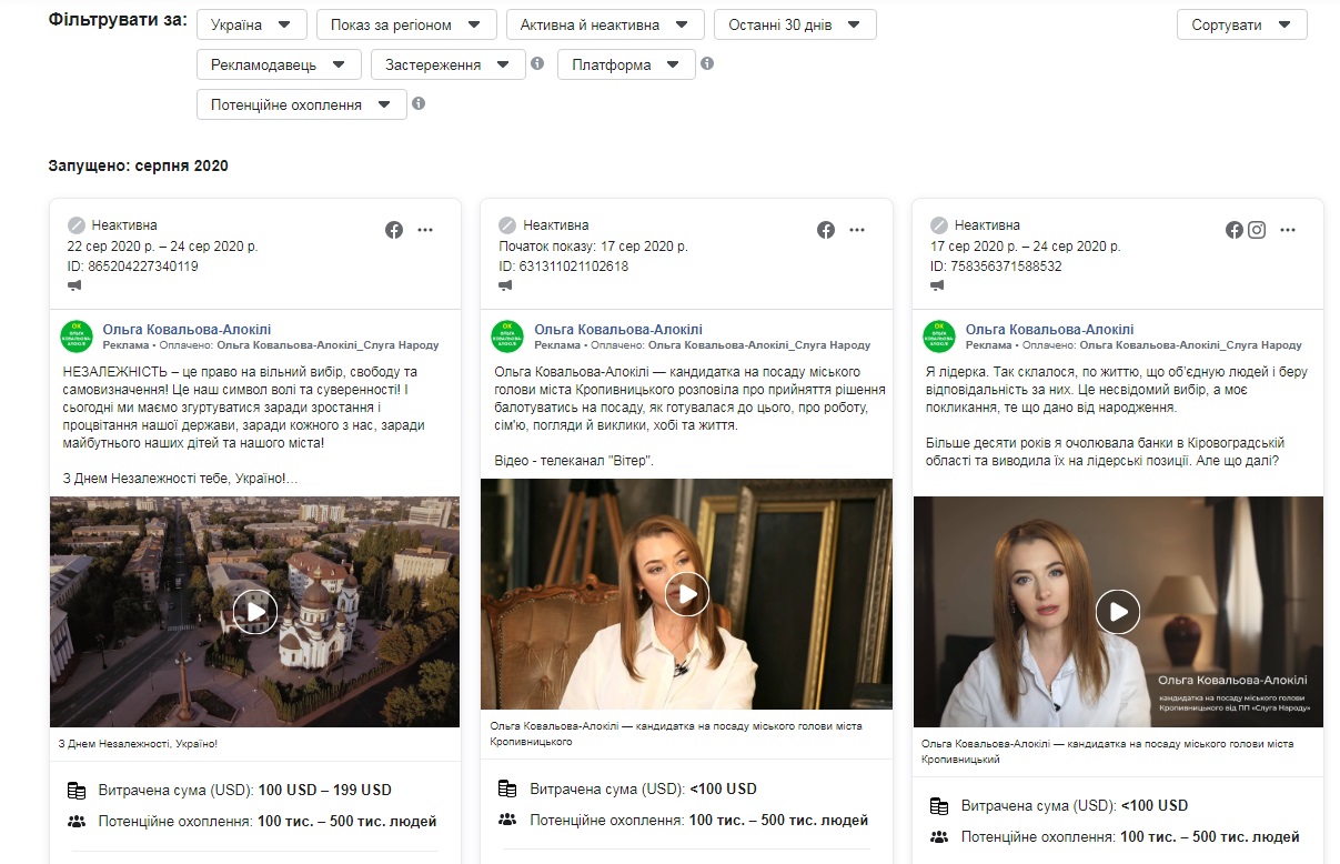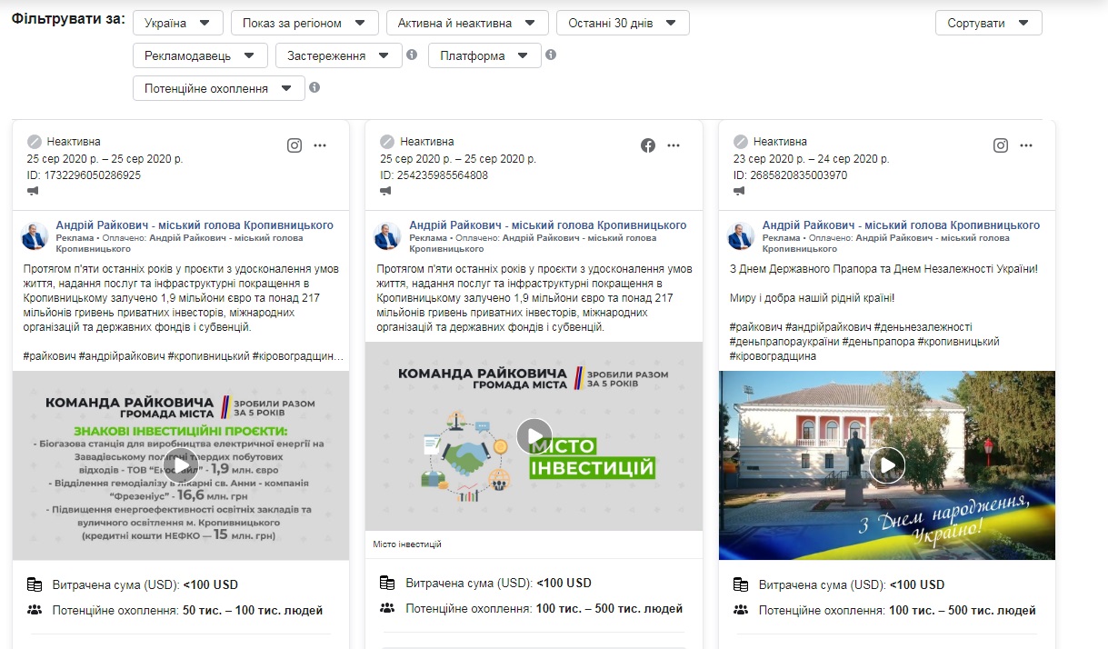 «Наразі у чинному законодавстві не врегульоване розміщення політичної реклами та агітації в соціальних мережах. Однак Facebook більше року тому почав маркувати українську політичну рекламу. І тепер можна відслідкувати вартість реклами, час її розповсюдження та хто її оплачував. Станом на серпень 2020 року, напередодні старту виборчого процесу місцевих виборів, можна говорити про збільшення активності сторінки міського голови Кропивницького Андрія Райковича та партії «Слуга народу», – зазначила координаторка спостереження Громадянської мережі ОПОРА за виборами у Кіровоградській області.