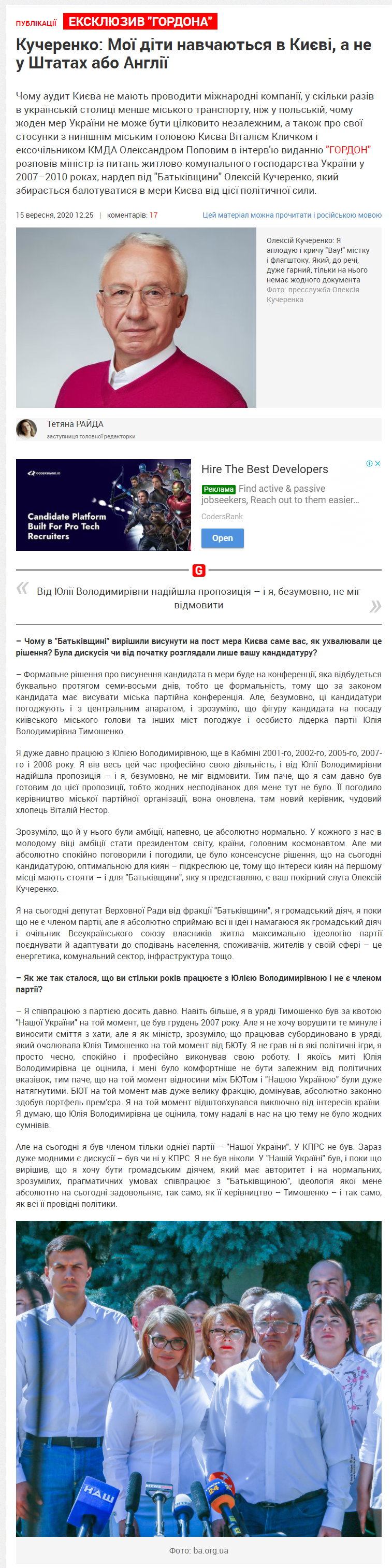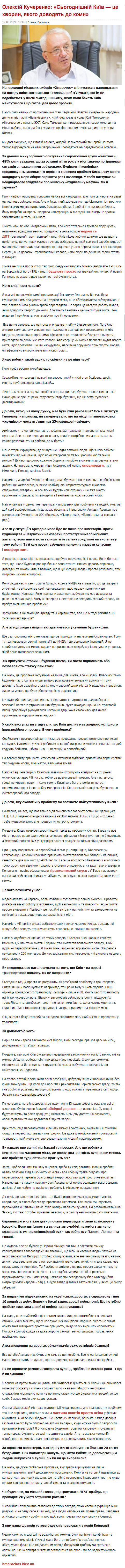 15 вересня видання опублікувало інтерв'ю з Олексієм Кучеренком «Кучеренко: Мої діти навчаються в Києві, а не у Штатах або Англії», в якому він розповів про себе, та намір йти на посаду міського голови. Загалом в інтерв’ю постать потенційного кандидата представлено з позитивного боку, а насамкінець політику ще й дали можливість озвучити, по суті, основні пункти своєї тоді ще майбутньої передвиборної програми. Він, зокрема, зазначив: «Гарантую киянам дуже прозору жорстку тарифну політику й тарифне регулювання щодо всіх комунальних та енергетичних тарифів у Києві, гарантую своєю особистою совістю, сімейством та іншим. Жодної копійки не дам нікуди вкрасти, навіть більше, не дам на тарифи вішати неефективне, погане, тупе управління комунальників і втрати безрозмірні тощо. Знаю, як це зробити, найкраще за всіх у країні… Гарантую кардинальне скорочення комунальних підприємств – збиткових, непотрібних, і наведу лад швидко, разом із киянами. Публічний аудит усього Києва».