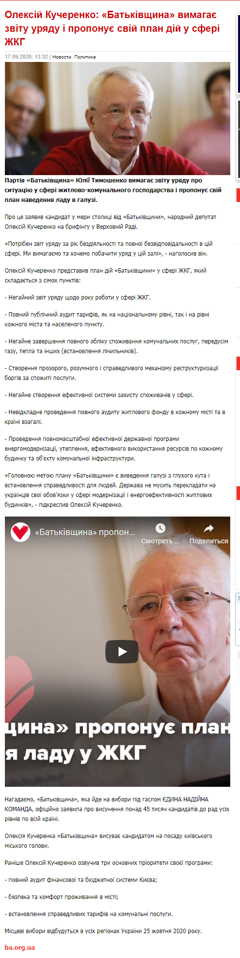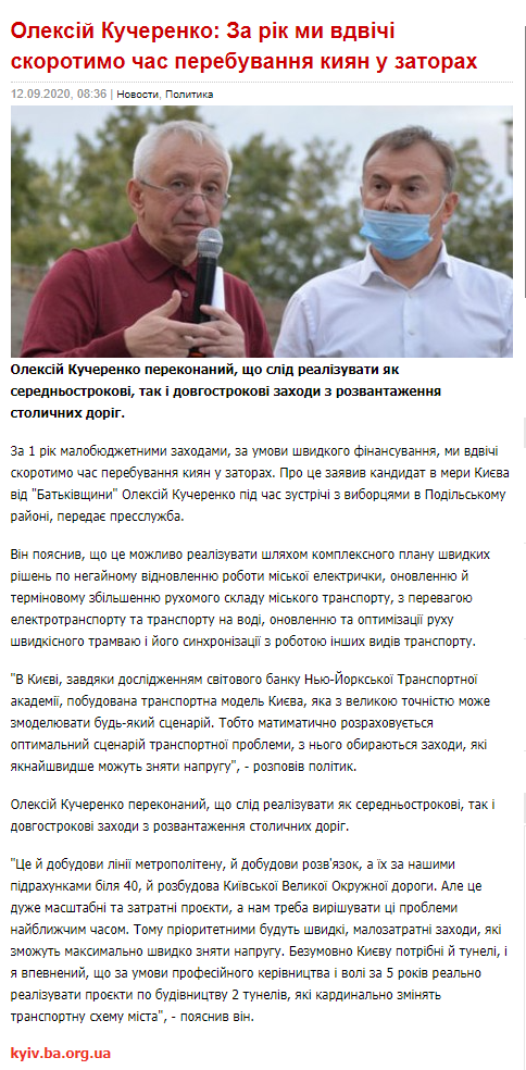 У передрукованому з сайту «Хмарочос» інтерв’ю (розміщене у «Вечерних Вестях» 12 вересня 2020 р.) «Олексій Кучеренко: «Сьогоднішній Київ — це хворий, якого доводять до коми» політика уже називають кандидатом на посаду київського міського голови і окреслюють його бачення необхідних в місті змін. В публікації «Олексій Кучеренко: За рік ми вдвічі скоротимо час перебування киян у заторах», що передрукована з сайту  Київської міської організації ВО «Батьківщина», йдеться про намір представника партії розвантажити столичні дороги. Матеріал від 17 вересня, передрукований з партійного вебсайту, цього разу всеукраїнського, – «Олексій Кучеренко: «Батьківщина» вимагає звіту уряду і пропонує свій план дій у сфері ЖКГ» – знайомить читача з «планом дій «Батьківщини» у сфері ЖКГ, який складається з сімох пунктів».