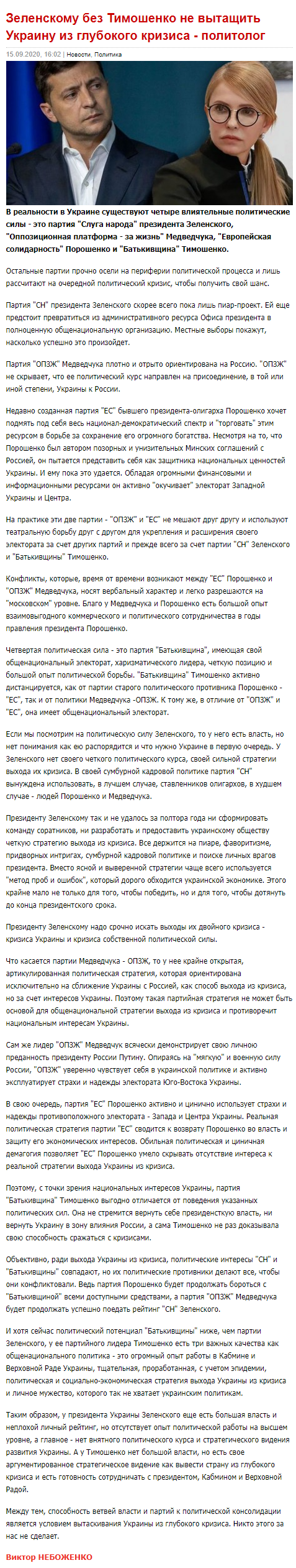 Крім того, ОПОРА фіксувала у виданні й матеріали на користь безпосередньо ВО «Батьківщина». До прикладу, в публікації «Зеленскому без Тимошенко не вытащить Украину из глубокого кризиса» (15 вересня) йдеться про переваги цієї політичної сили на тлі інших партій: «...с точки зрения национальных интересов Украины, партия «Батькивщина» Тимошенко выгодно отличается от поведения указанных политических сил. Она не стремится вернуть себе президенсткую власть, ни вернуть Украину в зону влияния России, а сама Тимошенко не раз доказывала свою способность сражаться с кризисами».