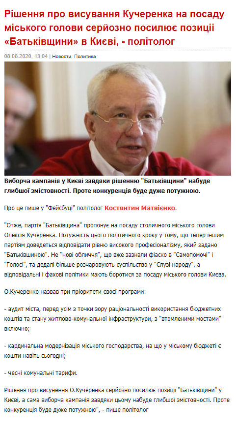 8 вересня медіа опублікувало замітку «Рішення про висування Кучеренка на посаду міського голови серйозно посилює позиції «Батьківщини» в Києві, - політолог».  У матеріалі, що дублює допис політолога Костянтина Матвієнка у Facebook від 8 серпня, акцентують увагу на «професіоналізмі» тоді ще потенційного кандидата на посаду міського голови Києва від ВО «Батьківщина» Олексія Кучеренка.
