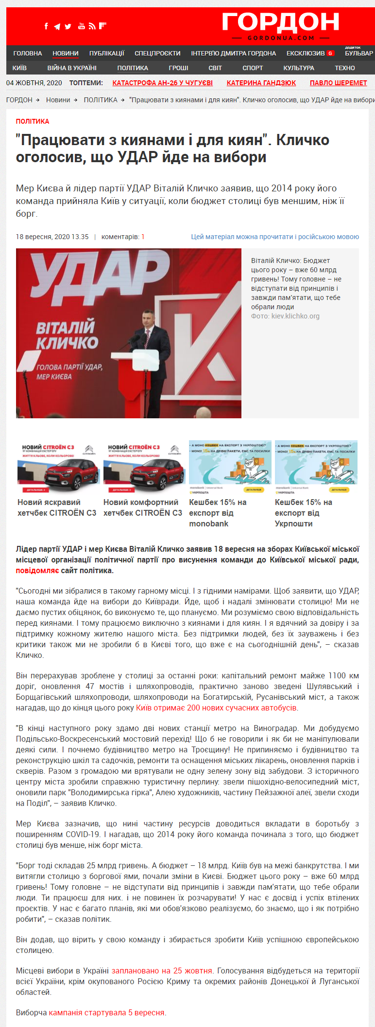 До прикладу, публікація «Працювати з киянами і для киян». Кличко оголосив, що УДАР йде на вибори» (18 вересня) відрізняється від звичайного повідомлення про висування кандидатів насамперед тим, що медіа наводить кілька цитат Віталія Кличка про його здобутки на посаді міського голови, наприклад: «В кінці наступного року здамо дві нових станції метро на Виноградар. Ми добудуємо Подільсько-Воскресенський мостовий перехід! Що б не говорили і як би не маніпулювали деякі сили. І почнемо будівництво метро на Троєщину! Не припиняємо і будівництво та реконструкцію шкіл та садочків, ремонти та оснащення міських лікарень, оновлення парків і скверів. Разом з громадою ми врятували не одну зелену зону від забудови. З історичного центру міста зробили справжню туристичну перлину: звели пішохідно-велосипедний міст, оновили парк «Володимирська гірка», Алею художників, частину Пейзажної алеї, звели сходи на Поділ». До того ж матеріал передруковано з сайту Віталія Кличка, а майже аналогічний, проте більший за обсягом текст, з таким самим заголовком розміщено у виданні «ZiK». А наявність тотожних матеріалів у різних виданнях – одна з ознак джинси.