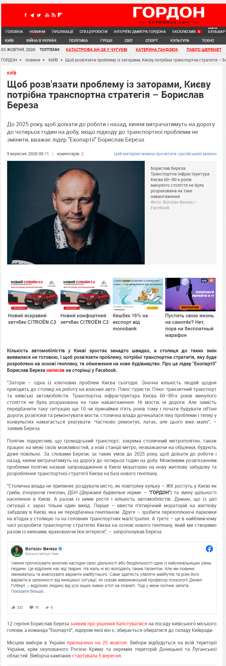 У матеріалі «Щоб розв'язати проблему із заторами, Києву потрібна транспортна стратегія – Борислав Береза» (9 вересня) цитують пост «лідера «Екопартії» у Facebook, у якому він говорить про способи розв’язання транспортної проблеми в Києві.