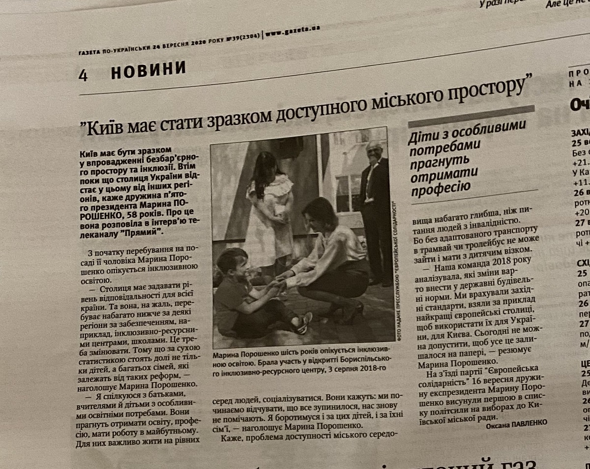 «Газета по-українськи», №39 від 24 вересня, опублікувала матеріал «Київ має стати зразком доступного міського простору», в якому йдеться про бачення Марини Порошенко щодо впровадження в місті безбар’єрного простору та інклюзії. Авторка замітки наводить таку цитату Марини Порошенко: «Наша команда 2018 року аналізувала, які зміни варто внести у державні будівельні норми. Ми врахували західні стандарти, взяли за приклад найкращі європейські столиці, щоб використати їх для України, для Києва. Сьогодні не можна допустити, щоб усе це залишалося на папері». А відтак у тексті зазначено, що Марину Порошенко висунули першою в списку партії «Європейська солідарність» до Київради.