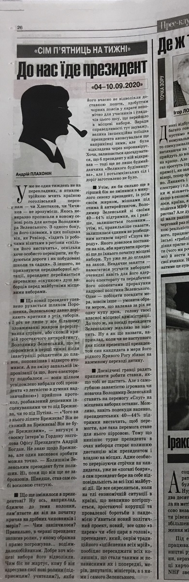 Єдиний матеріал з ознаками контрагітації ОПОРА зафіксувала у виданні «День» (№№171-172 від 11-12 вересня). Хоча загалом колонка присвячена критиці діяльності президента, однак її оприлюднення саме в період виборчої кампанії дає підстави зараховувати її до матеріалів з ознаками агітації проти. У матеріалі автор, зокрема, зазначає: «Досвідчені гравці радять припинити робити ставки, якщо тобі не щастить. Але з самогубною завзятістю ігромана чи новачка Володимир Зеленський ставить на перемогу «Слуг» на місцевих виборах останнє. Можливо, навіть подекуди напевно, президентських 40—44% підтримки вистачить, щоб перемогти, але така перемога стане для нього пірровою».