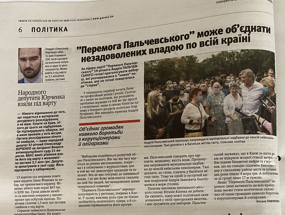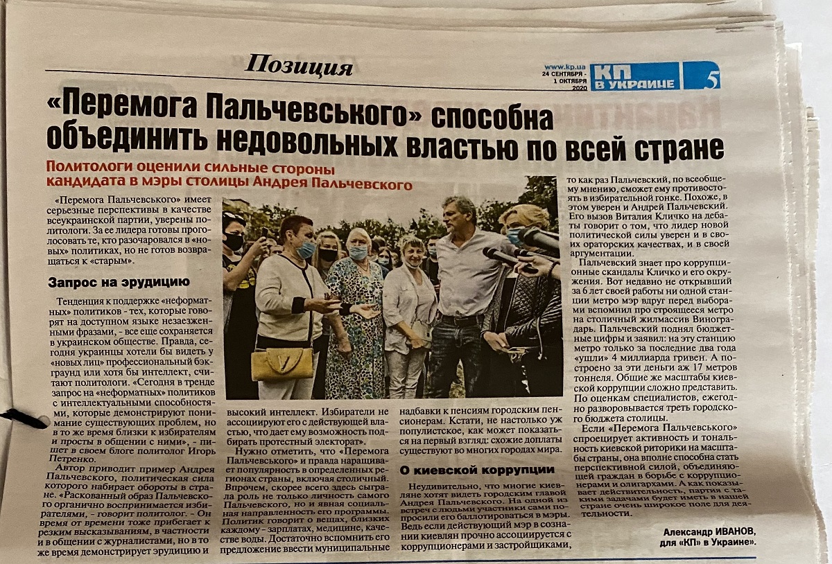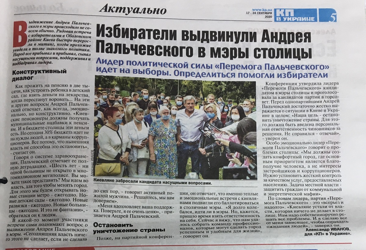 Схожу публікацію можна побачити і на шпальтах газети «КП в Украине» від 17 вересня. Під заголовком «Избиратели выдвинули Андрея Пальчевского в мэры столицы» з емоційними цитатами і схвальними характеристиками (проте без належного маркування) автор розповідає про намір Андрія Пальчевського йти на вибори.
