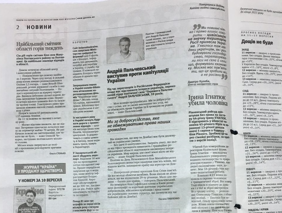 У тижневику «Газета по-українськи», №37 від 10 вересня, опублікували короткий матеріал «Андрій Пальчевський виступив проти капітуляції України», у якій йдеться про позицію лідера партії «Перемога Пальчевського» щодо актуального для українців питання російсько-українських взаємин. «Мир на Донбасі має бути досягнутий на українських умовах», - цитує політика авторка матеріалу. Публікацію такого ж змісту, але російською мовою («Андрей Пальчевский против капитуляции Украины») опублікувало й видання «КП в Украине» від 10 вересня.