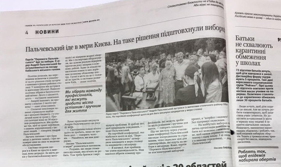 «Газета по-українськи», №38 від 17 вересня, пропонує читачам матеріал «Пальчевський іде в мери Києва. На таке рішення підштовхнули виборці», що позитивно характеризує рішення партійців брати участь у виборчих перегонах.