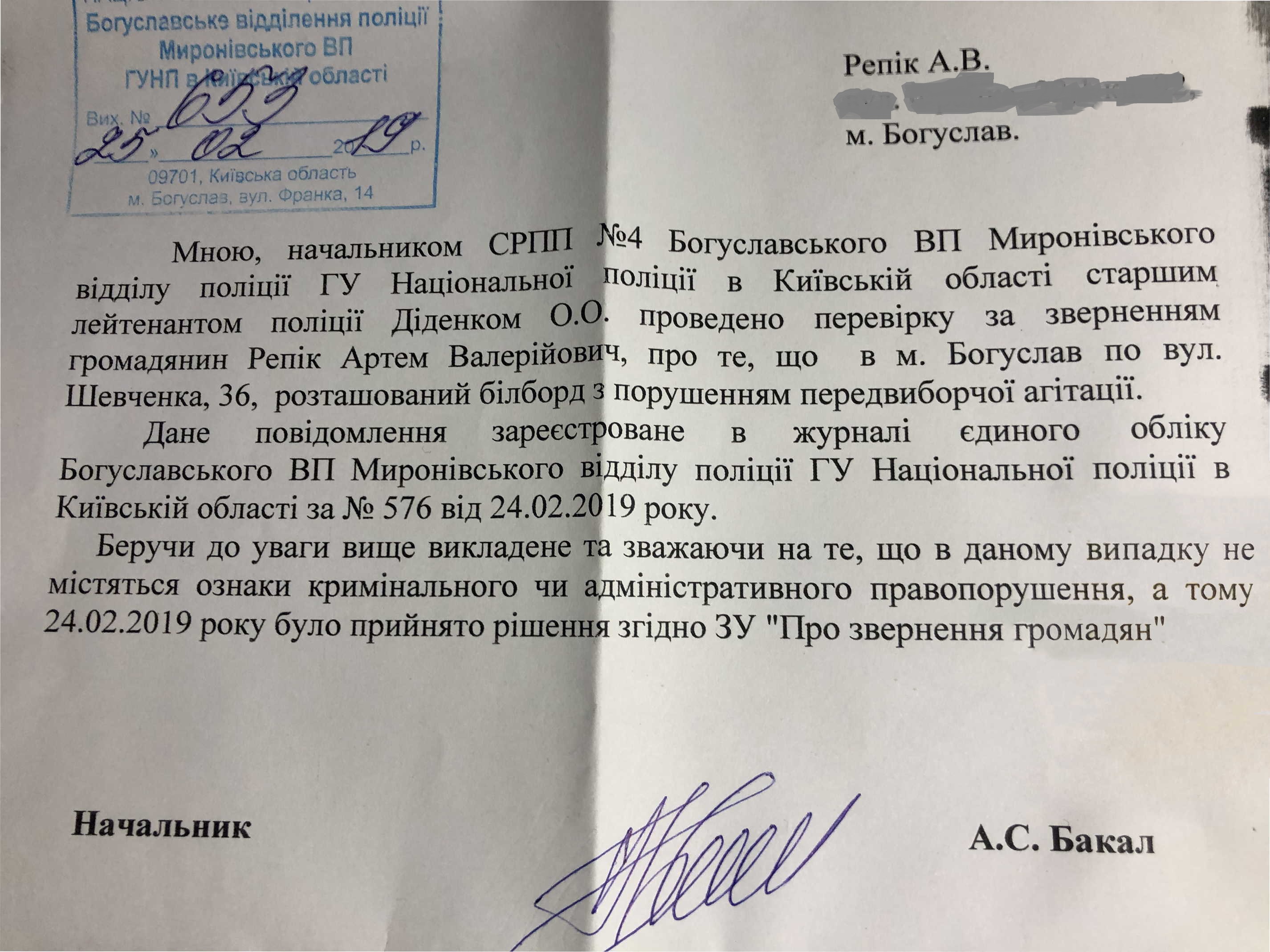 Пізніше заявник, спостерігач ОПОРИ отримав відповідь від Богуславського відділення поліції, що дане повідомлення зареєстровано у журналі єдиного обліку Богуславського ВП Миронівського відділу поліції ГУ Нацполіції у Київській області, а також що «в даному випадку не містяться ознаки кримінального чи адміністративного правопорушення».