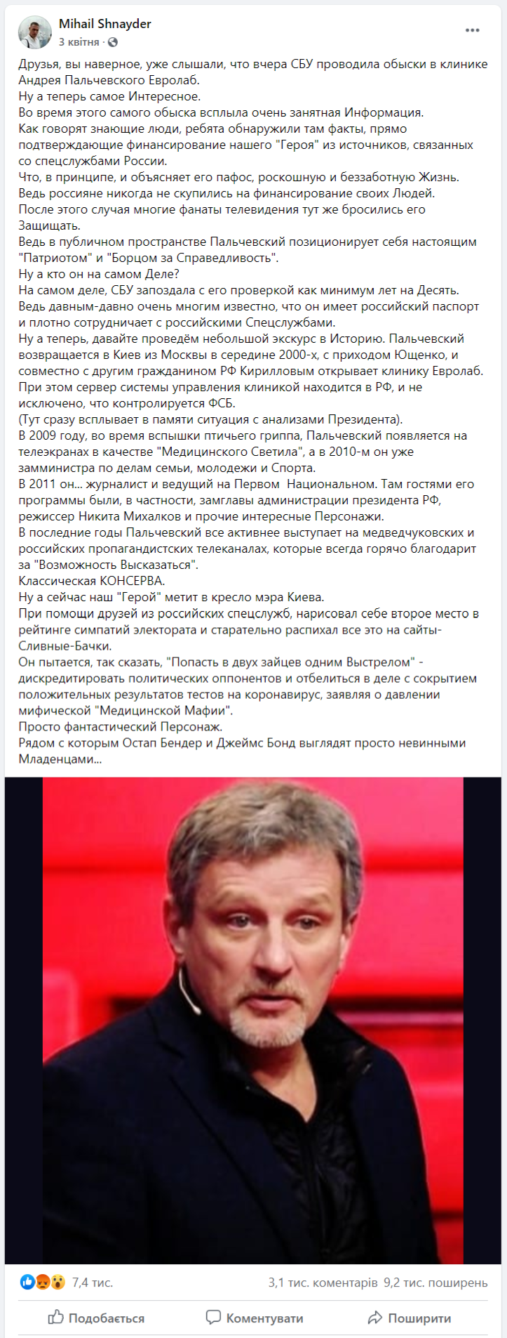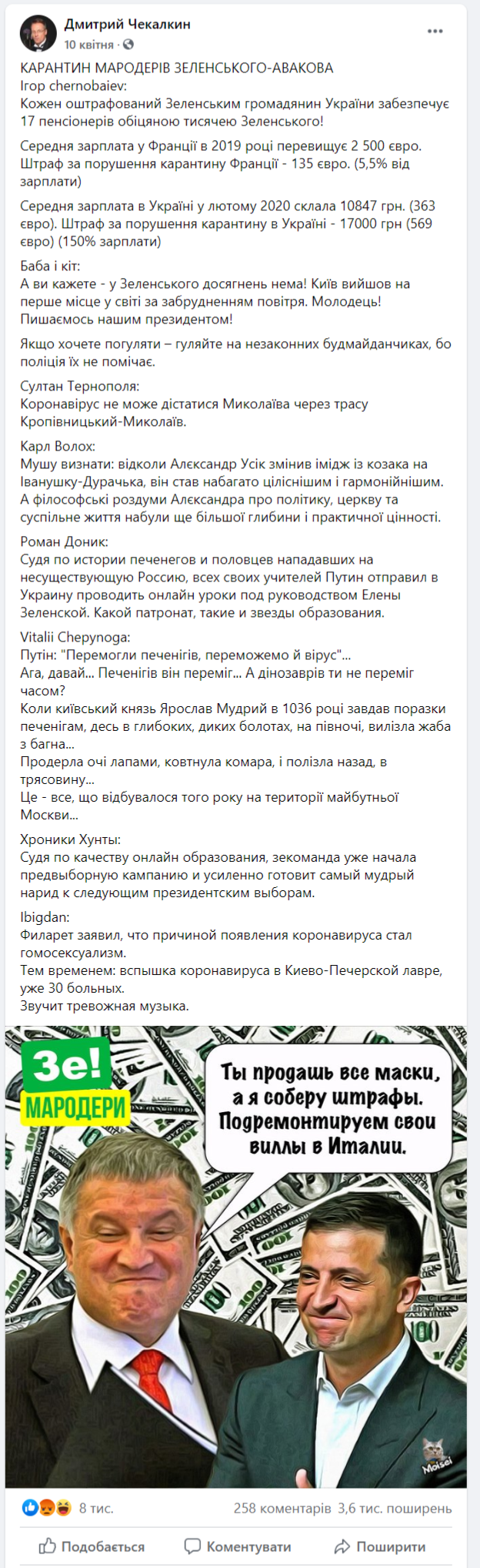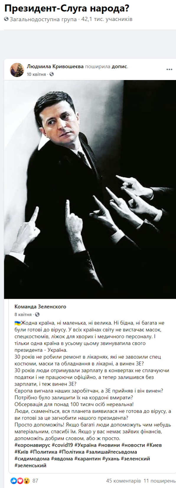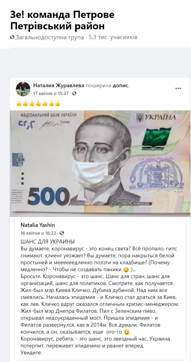 Політичні дискусії в соцмережах під час карантину загострились: побільшало критики місцевої та центральної влади, закликів до «нового Майдану» тощо. Деякі провокаційні пости виникали одночасно на багатьох сторінках — наприклад, допис блогера Михайла Шнайдера, який дискредитує бізнесмена, телеведучого і ймовірного кандидата на пост київського міського голови Андрія Пальчевського, за три дні опублікували шістнадцять фейсбук-сторінок: