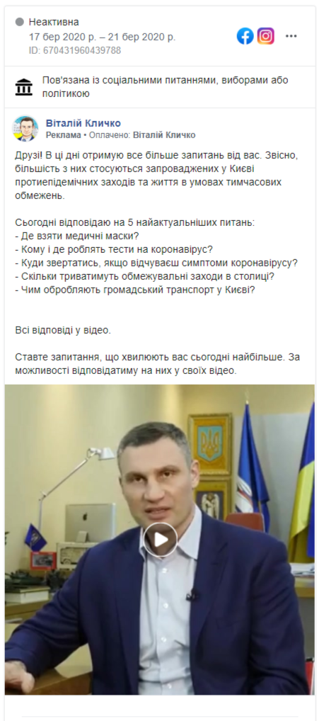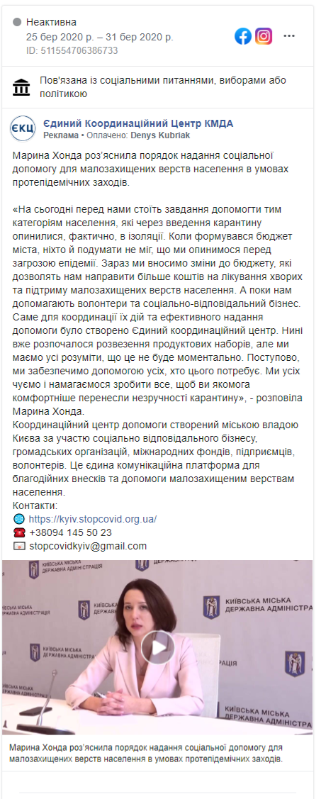 Влада Києва використовувала фейсбук-рекламу передусім для інформування про карантинні заходи. Сторінка «Єдиний координаційний центр КМДА» поширювала корисні поради щодо життя й роботи в умовах карантину, а рна сторінці Віталія Кличка просували дописи, в яких він відповідав на запитання підписників: