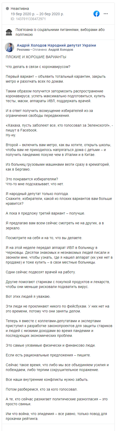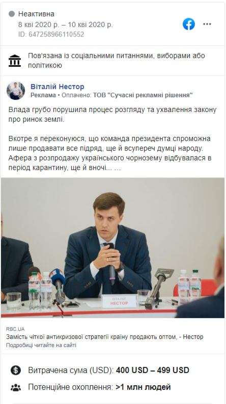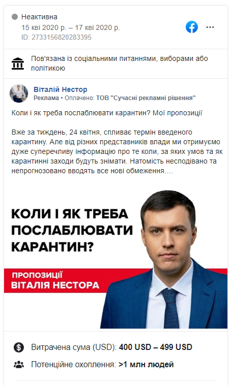 Опозиційні політики найчастіше використовували фейсбук-рекламу для критики дій центральної влади, зокрема запровадження карантину. Особливо відзначився потенційний кандидат у мери Києва від «Батьківщини» Віталій Нестор. Він витратив на рекламу в фейсбуку найбільше — за 18 дописів заплатив понад 5 тисяч доларів: