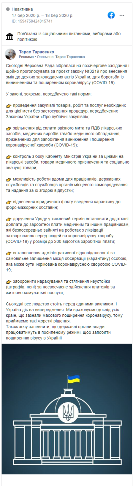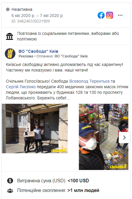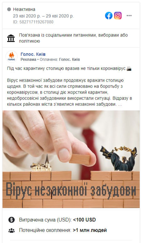 Українське законодавство не вважає оплачені повідомлення в соціальних мережах політичною рекламою. Тож політики, які передчасно почали рекламну кампанію на зручному тлі коронавірусної пандеміїі, нічим не ризикують. Це нагода продемонструвати виборцям свою турботу про їхнє здоров’я та безпеку, якою скористались чимало майбутніх учасників місцевих виборів. За допомогою Бібліотеки реклами Facebook та інструменту Facebook Analyzer ми виявили три десятки сторінок політичного змісту, які поширювали інформацію про коронавірусну епідемію в Києві:
