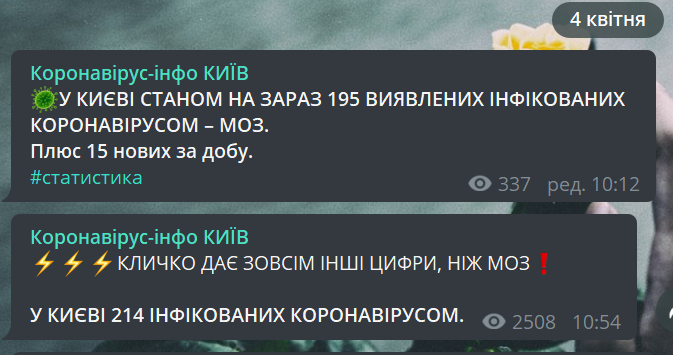 Помітною тенденцією в телеграм-каналах було намагання підірвати довіру до статистики захворюваності від Міністерства охорони здоров’я. Значно менше критикували та ставили під сумнів статистику, яку озвучував Віталій Кличко на щоденних брифінгах. Наприклад, канал «Коронавірус-інфо КИЇВ» майже щодня протиставляв цифри, які озвучував Кличко, статистиці міністерства: