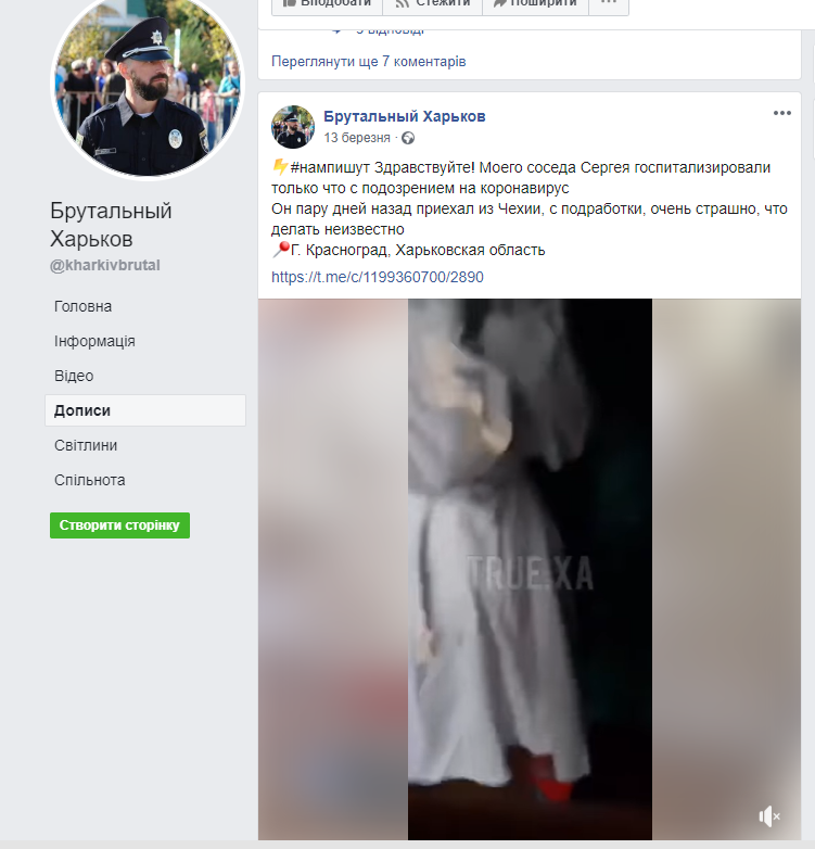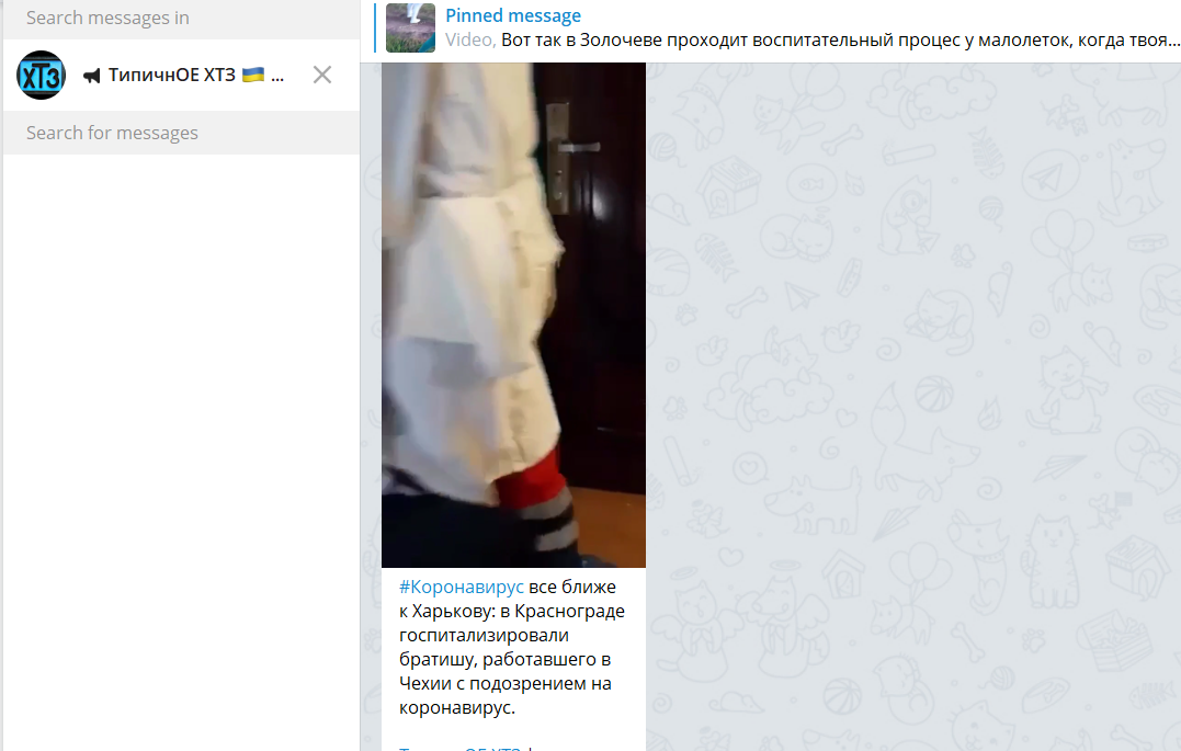 У телеграм-каналах поширювали повідомлення «Моего соседа госпитализировали только что с подозрением на коронавирус. Он пару дней назад приехал из Чехии, с подработки, очень страшно, что делать неизвестно». Воно з’явилось у каналах «Лентач Харьков», «Это Харьков», «ХС | Харьков», Kharkiv Journal, «Харьков 1654», «Типичное ХТЗ».