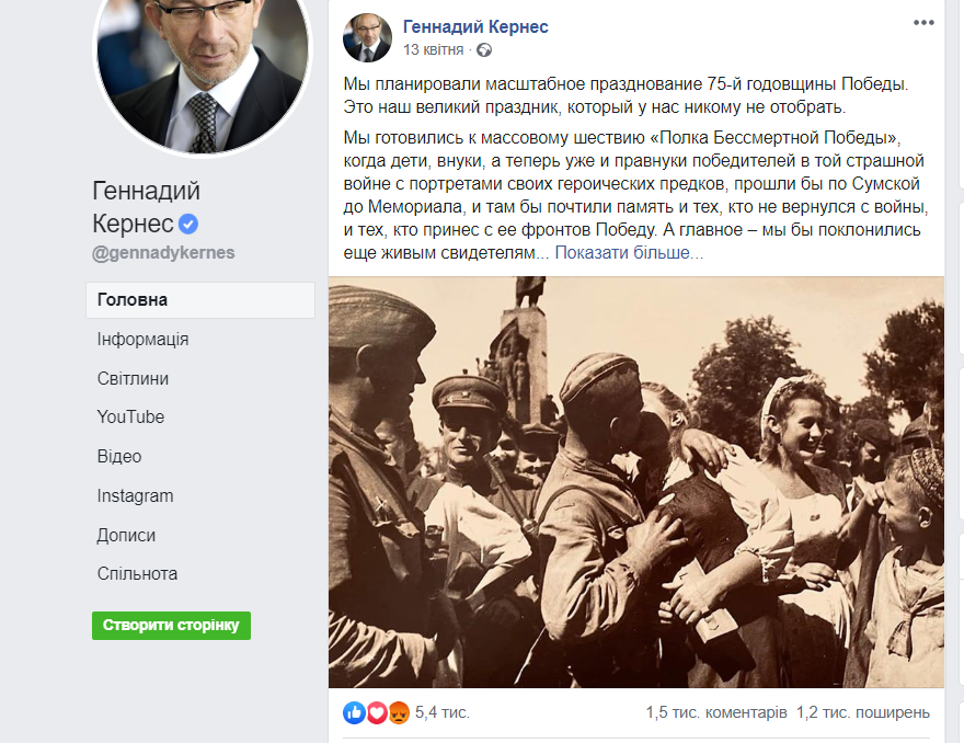 Найбільш обговорюваною темою харківського фейсбуку стала акція «Полк безсмертної перемоги», яку запропонував провести Геннадій Кернес. Він написав: «Похоже, карантин и сроки чрезвычайной ситуации в Украине затронут и 9-е мая. Массовых мероприятий, скорее всего, проводить будет нельзя. Но, к счастью, даже коронавирус не в силах заставить нас полностью отказаться от идеи проведения «Полка Бессмертной Победы». Я призываю вас 9-го мая, ровно в 12:00 выйти на балконы ваших квартир с фотографиями ваших дедов и прадедов и провести общегородскую минуту Молчания, Памяти и Благодарности их подвигу».
