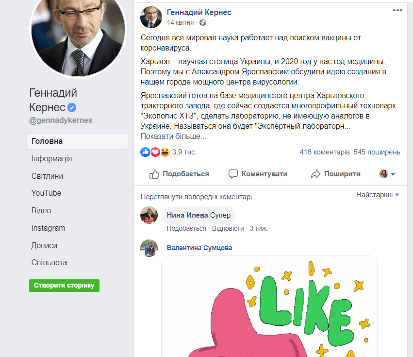 У фейсбуку та телеграмі часто поширюються повідомлення Кернеса про закупівлю масок для медиків і містян, а також про те, що разом із Ярославським мер ініціює створення центру вірусології, куди будуть запрошені «провідні вірусологи» для розробки вакцин — від коронавірусної та інших хвороб.
