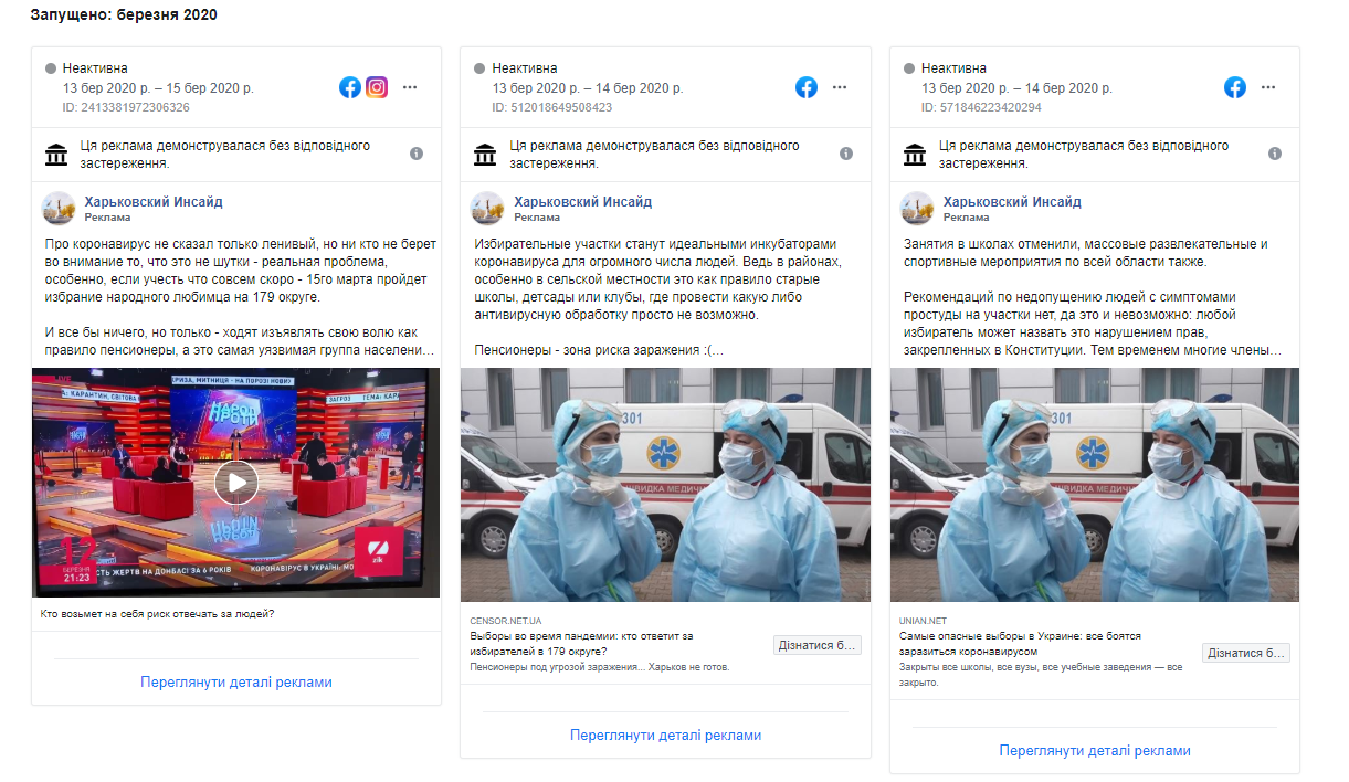 Фейсбук-сторінка «Харьковский инсайд» 13-15 березня запустила три рекламні кампанії з закликами не проводити вибори та попередженнями, що виборчі дільниці стануть «інкубаторами коронавірусу», а члени комісій бояться виходити на роботу. Посилались у цих повідомленнях на матеріали онлайн-видань «Цензор.нет» та УНІАН.