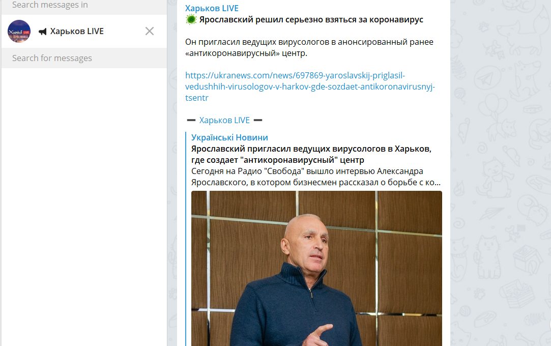 Ця ініціатива, а також закупівля Ярославським медичних масок і тестів, висвітлюється в популярних харківських телеграм-каналах позитивно. У каналах «Лентач Харьков», «ХС | Харьков», «Харьков LIVE», «Фак-ты-ХА», «ТипичнОЕ ХТЗ», Kharkiv Journal ми нарахували близько сотні повідомлень на зразок «Ярославский пригласил ведущих вирусологов в Харьков», «Ярославский: "Мы порвём этот коронавирус"», «Ярославский просто красавчик. Благодаря ему появилась возможность оперативно выявлять заболевших, тем самым минимизируя распространение этого вируса» і тому подібних.