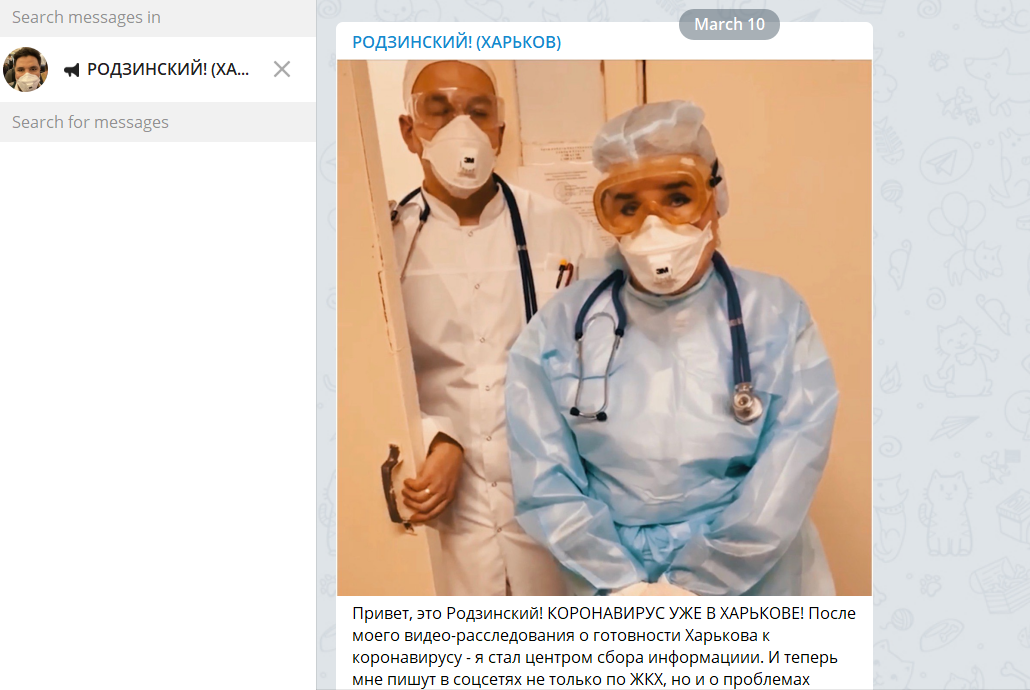 12 березня в своєму новому каналі Родзинський закликав харків’ян приходити до міської ради, де він безкоштовно роздаватиме медичні маски: