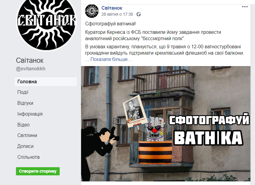 Фейсбук-групи «Луганская Народная Республика» і «Международный союз антифашистов» відреагували на це дописами «Харьковские бандеровцы собираются 9 Мая фотографировать «ватников» на балконах и доносить на них в СБУ».