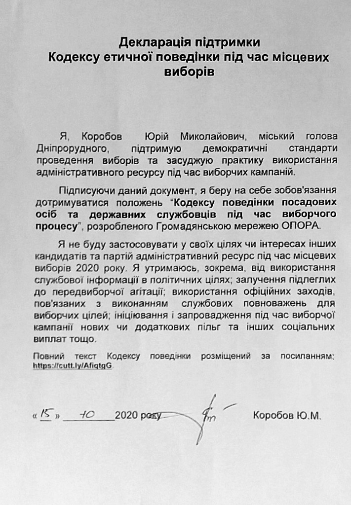 «Я, Коробов Юрій Миколайович, міський голова Дніпрорудного підтримую демократичні стандарти проведення виборів та засуджую практику використання адміністративного ресурсу під час виборчої компанії. Підписуючи даний документ я беру на себе зобов’язання дотримуватися положення «Кодексу поведінки посадових осіб та державних службовців під час виборчого процесу», розробленого Громадянською мережею ОПОРА. Я не буду застосовувати у своїх цілях чи в інтересах інших кандидатів та партій адміністративний ресурс під час місцевих виборів 2020-го року. Я утримаюся, зокрема, від використання службової інформації в політичних цілях; залучення підлеглих до передвиборчої агітації; використання офіційних заходів пов’язаних з виконанням службових повноважень для виборчих цілей; ініціювання під час виборчої компанії нових чи додаткових пільг чи інших соціальних виплат тощо. Я ставлю підпис під цим документом для того, щоб в нашому місті і в громаді вибори відбулися прозоро і максимально чесно»