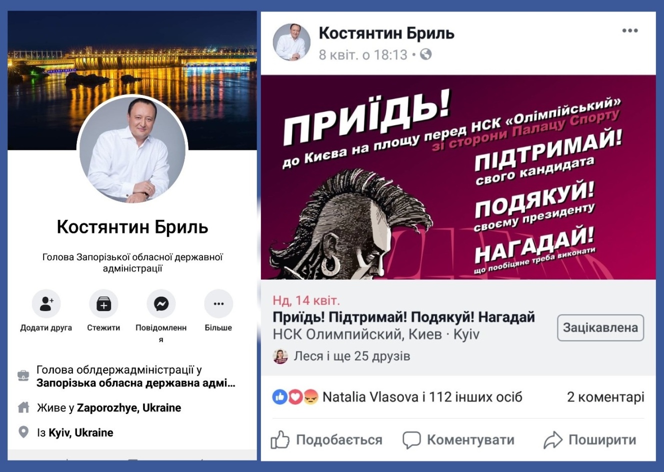 8 квітня на своїй сторінці у фейсбук голова Запорізької обласної державної адміністрації Костянтин Бриль поширив заклик приїхати 14 квітня до Києва на площу перед НСК «Олімпійський», щоб підтримати «свого кандидата» і подякувати «своєму президенту». В оформлені афіші використане упізнаване зображення обличчя Петра Порошенка.