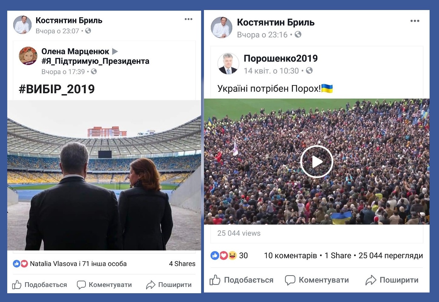 Зазначимо, що на сторінці Костянтина Бриля систематично розміщуються репости з інформацією на підтримку цього кандидата у Президенти.