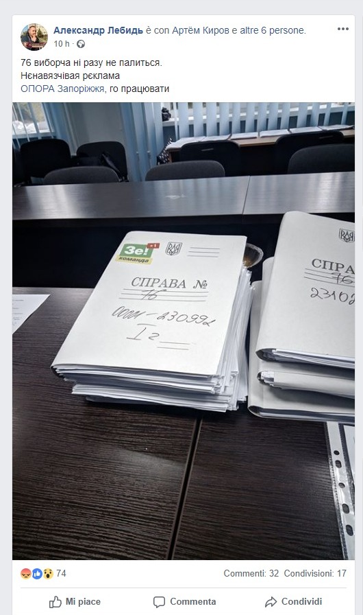 15 квітня до ОПОРИ звернувся мешканець Запоріжжя Олександр Лебидь із проханням звернути увагу, що нібито під час засідання ОВК в ТВО №76 на папці для робочої документації використана наліпка із можливою ознакою агітації. До свого звернення він додав світлину.