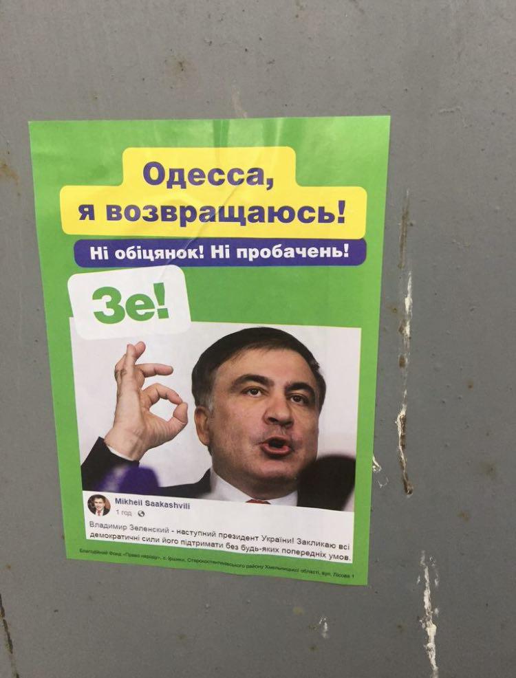 Так, у п’ятницю та суботу в районі біля ринку «Привоз» було виявлено листівки без вихідних даних із зображенням колишнього голови Одеської облдержадміністрації Міхеїла Саакашвілі, який публічно висловлював свою підтримку кандидату на пост Президента Володимиру Зеленському, з написом: «Одесса, я возвращаюсь. Ні обіцянок, ні пробачень».