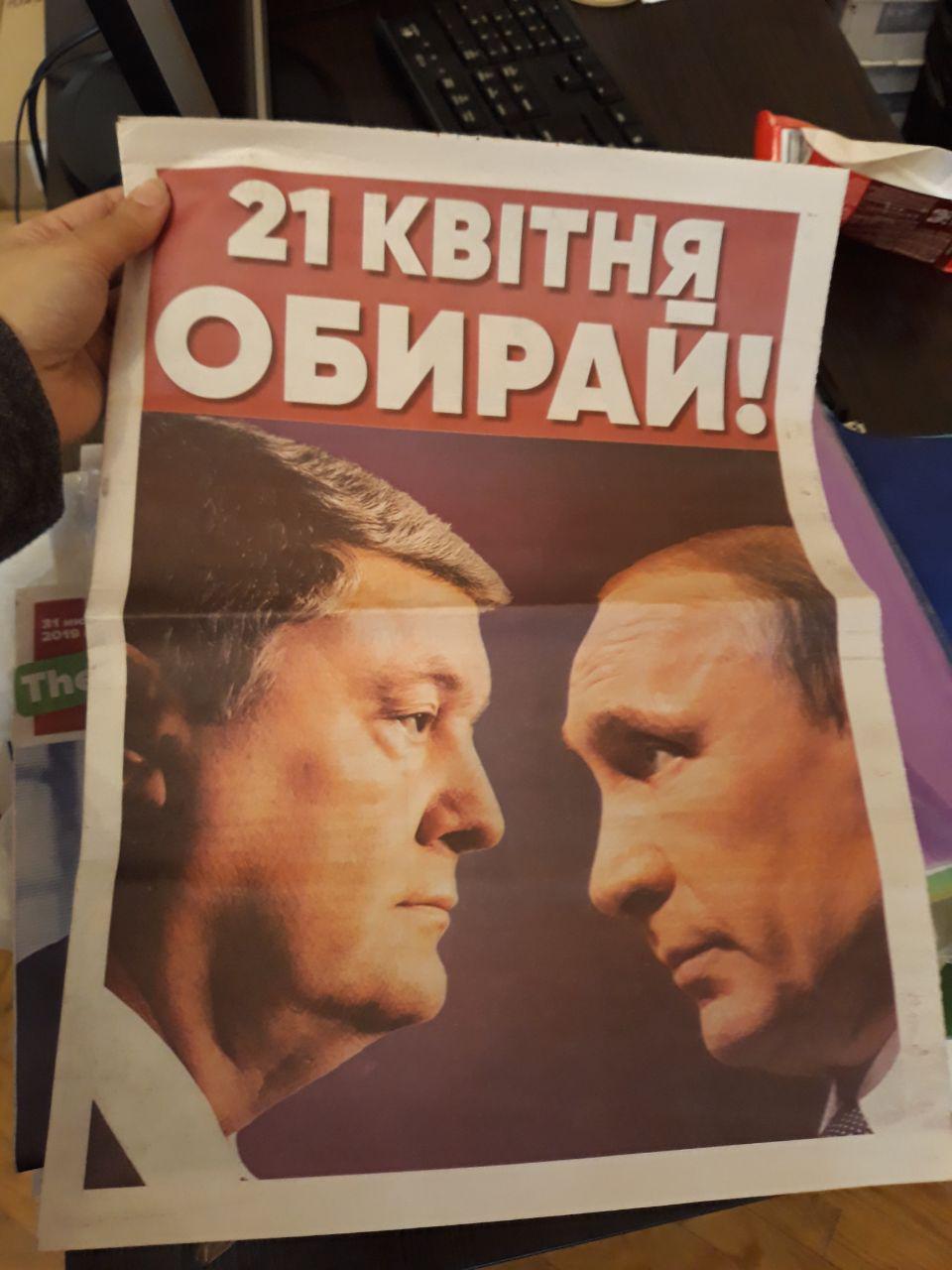 У центрі міста було зафіксовано випадки роздачі газет із зображенням кандидата на пост Президента України Петра Порошенка та президента Російської Федерації Володимира Путіна.