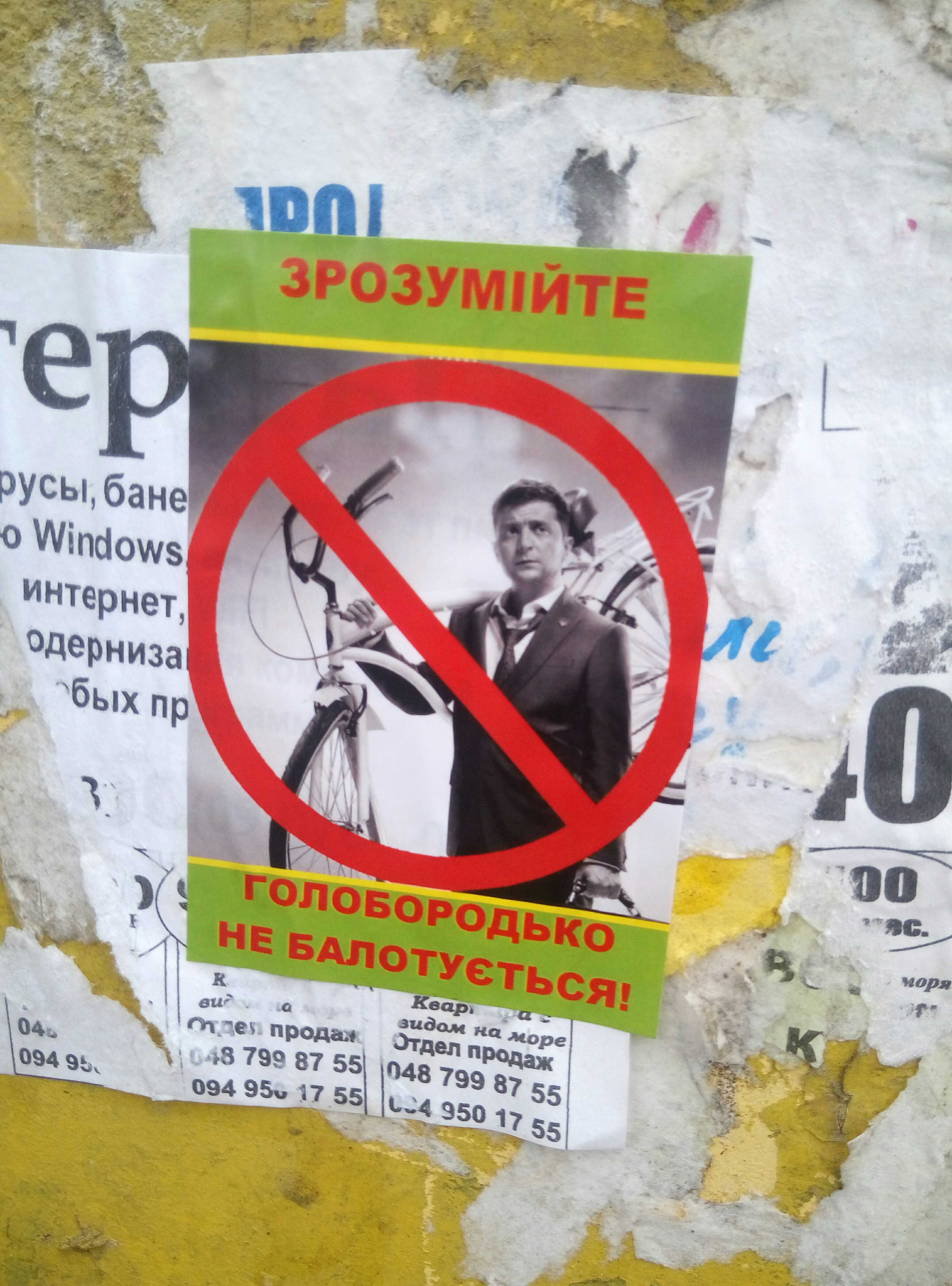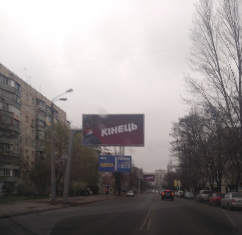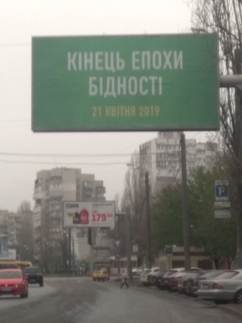 Водночас у спальному Київському районі Одеси спостерігачі зафіксували білборди без ознак прямої агітації, але виготовлені у кольоровій гамі та стилістиці, що відповідають друкованій продукції на підтримку кандидата Володимира Зеленського у першому турі, з написом «Кінець епохи бідності. 21 квітня 2019».