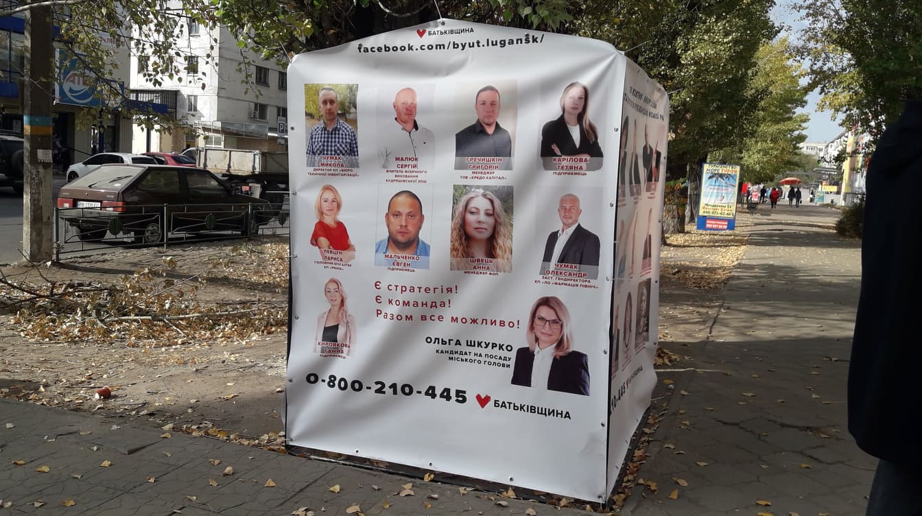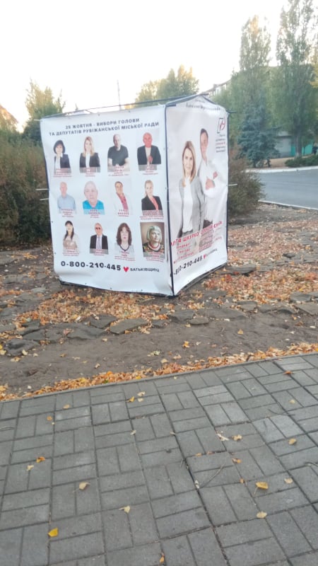 У Рубіжному спостерігач ОПОРИ зафіксувала 3 куби із політичною рекламою без вихідних даних із написом «Батьківщина», на яких міститься текст: «25 жовтня вибори голови та депутатів Рубіжанської міської ради. 0800210445.Батьківщина». Поряд із написом на банерах розмішені фотографії та прізвища кандидата на посаду міського голови та кандидатів у депутати міськради. Вказані елементи зовнішньої реклами містять ознаки здійснення передвиборної агітації на користь організації політичної партії Всеукраїнське об’єднання «Батьківщина». Місцева партіїна організація є суб‘єктом виборчого процесу згідно з п.3 ч.1 ст. 22 Виборчого кодексу України, адже вона висунула та зареєструвала кандидатів на відповідних виборах. Ці банери не містять вихідних даних, що передбачено законодавством. А саме, відповідно до ч. 2 ст. 53 Виборчого кодексу України друковані матеріали передвиборної агітації повинні містити відомості про підприємство, що здійснило друк, або інформацію, що друк здійснено з використанням обладнання відповідного кандидата або партії (організації партії), яка висунула кандидата (кандидатів), їх тираж, інформацію про осіб, відповідальних за випуск, та замовника відповідних матеріалів.