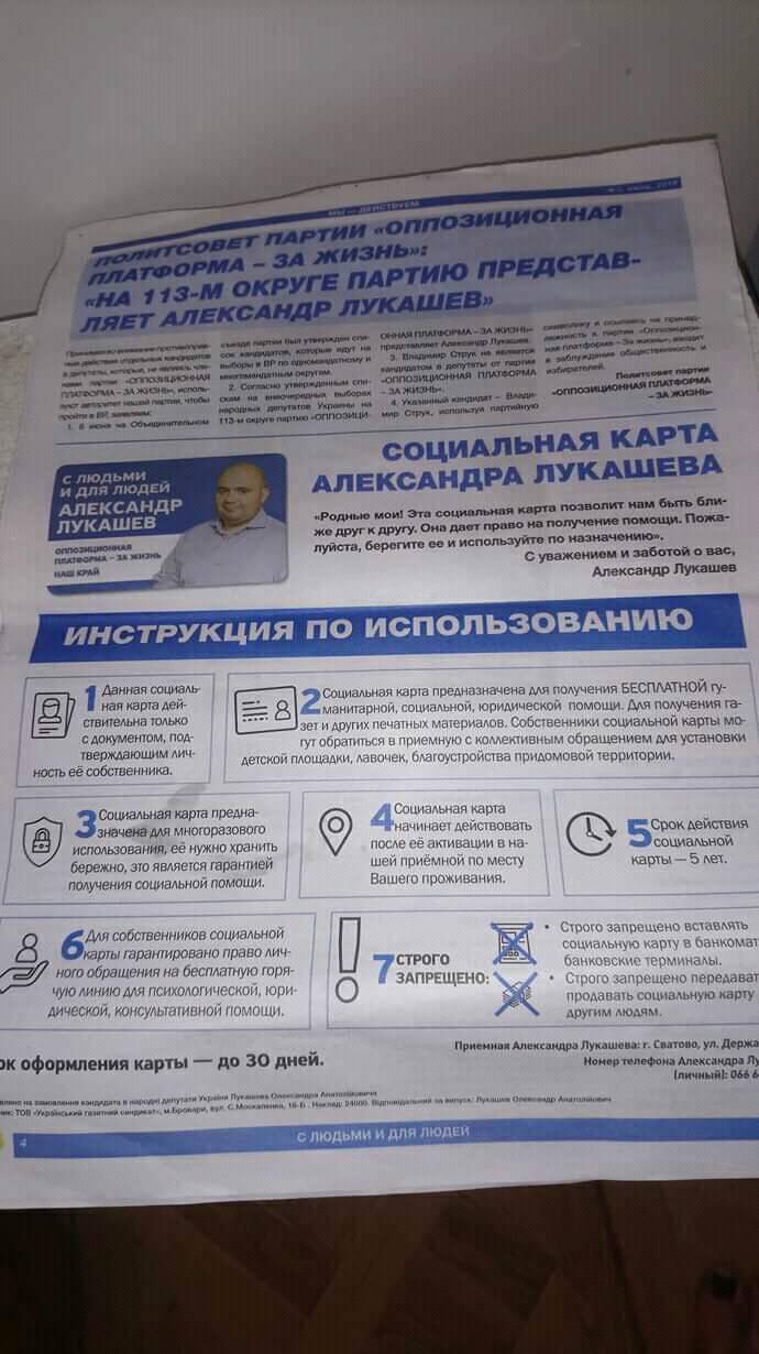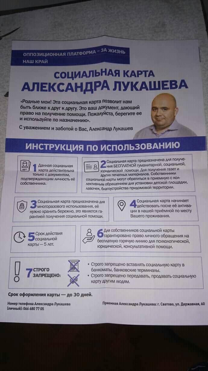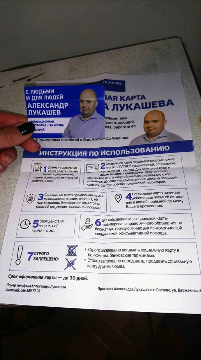 Водночас, у Троїцькому районі Луганської області (входить до 113 ОВО) аналогічна ситуація склалася із іншим членом «команди Сергія Шахова» - кандидатом у нардепи від «Опозиційної платформи – за життя» Олександром Лукашевим. Контактерам ОПОРИ під виглядом реципієнтів благодійної допомоги вдалося оформити зазначену «соціальну карту» та отримати інструкції щодо її використання у буклеті з назвою «Социальная карта Александра Лукашева».