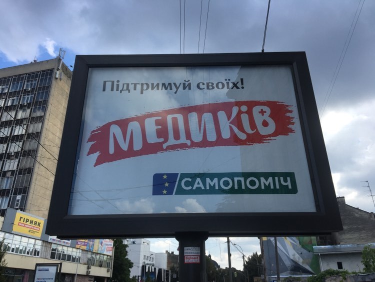 Об'єднання «Самопоміч» розмістило свою рекламу із закликом «Підтримуй своїх! Медиків». Окрім згадки про працівників медичних установ, є аналогічні білборди з підтримкою вчителів, волонтерів, виробників, захисників України.