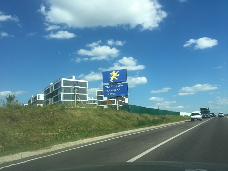 У місті Львові та на околицях є зовнішня реклама Української галицької партії. На синьому фоні або назва політичної сили, або зображення жовтого лева.