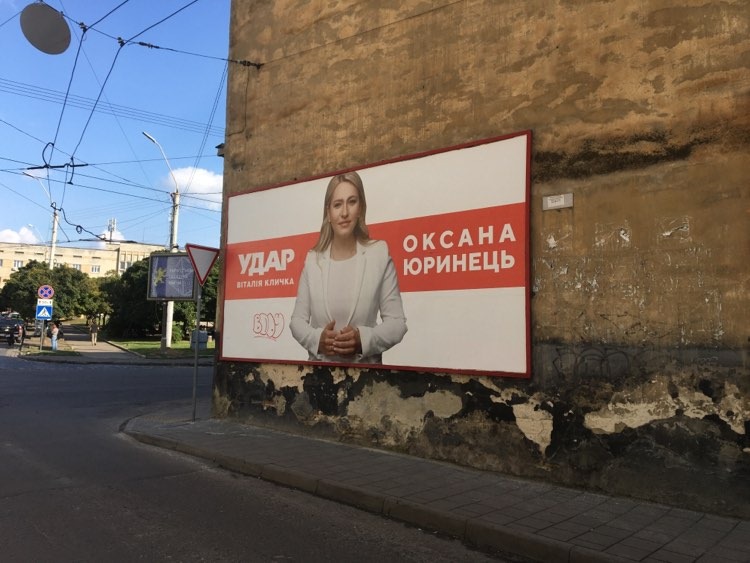 На білбордах у Львові партію Віталія Кличка «УДАР» рекламує Оксана Юринець. Вона є представницею цієї політичної сили. З 2014 по 2019 роки Юринець була народною депутаткою восьмого скликання Верховної Ради України (Блок Петра Порошенка «Солідарність»). 27 серпня вона офіційно заявила, що балотуватиметься на посаду міського голови Львова від партії «УДАР».