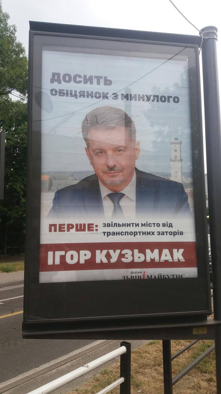 Є у Львові сітілайти із зображенням Ігоря Кузьмака, який 12 серпня під час пресконференції оголосив про те, що балотуватиметься на посаду міського голови Львова від Народного Руху України. На них текст: «Львів потребує змін. Досить жити без перспективи», «Досить обіцянок з минулого. Перше: звільнити місто від транспортних заторів». Ігор Кузьмак - архітектор та керівник громадської організації «Форум Львів і майбутнє».