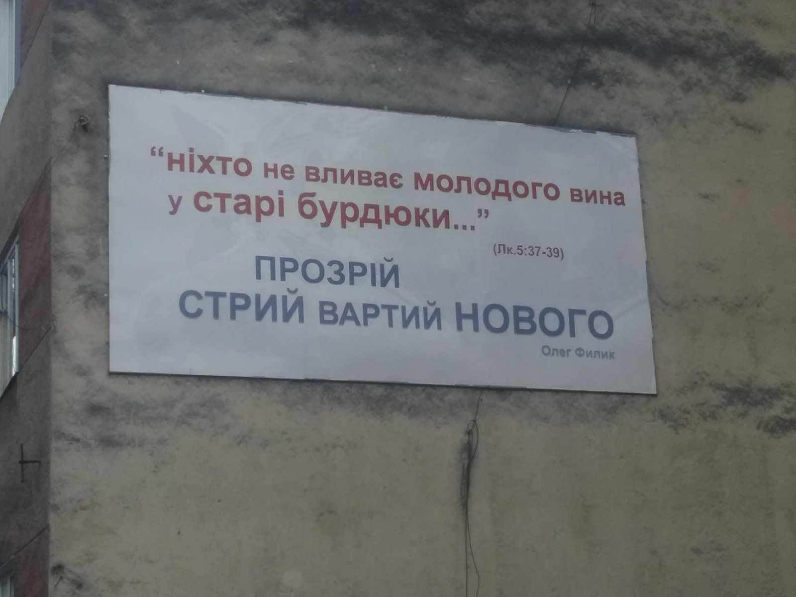 На одному з будинків у центрі міста є плакат з надписом «Ніхто не вливає молодого вина у старі бурдюки… Прозрій. Стрий вартий кращого. Олег Филик». Филик - чинний депутат Стрийської міської ради. У 2019 році на позачергових парламентських виборах кандидував як самовисуванець у 126 окрузі.
