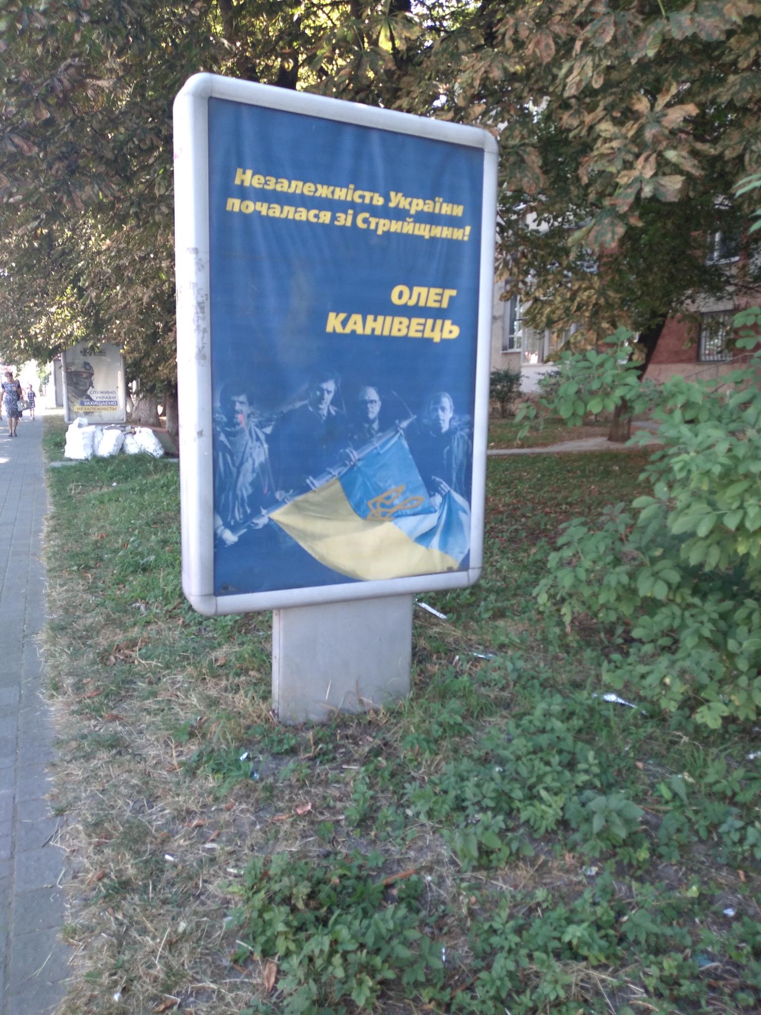 У блакитно-жовтих кольорах є рекламні матеріали Олега Канівця: чотири сітілайти і три білборди з надписом «Незалежність України почалася зі Стрийщини!» На минулорічних парламентських виборах Канівець балотувався у 126 виборчому окрузі (суб'єкт висування «Громадянська позиція» ). Також чоловік є головою благодійного фонду «Добре серце» .