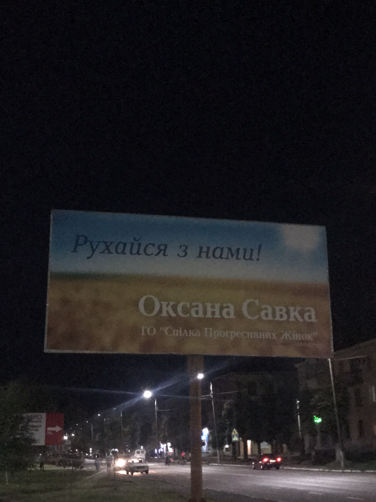 Три білборди з текстом «Рухайся з нами» є адвокатеси та керівниці громадської організації «Спілка прогресивних жінок» Оксани Савки.