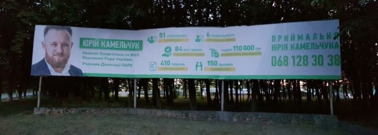 Також спостерігачі ОПОРИ зафіксували 5 плакатів народного депутата від «Слуги народу» Юрія Камельчука, в яких він звітує про свою діяльність на окрузі та у парламенті.