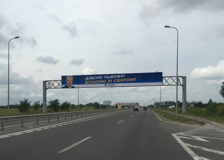 Напередодні Дня Державного Прапора та Дня Незалежності частину зовнішньої реклами з Олегом Синюткою замінили. На білбордах та розтяжках з'явилися зображення Петра Порошенка текстом «Дякую Львову! Вітаємо зі святом!».