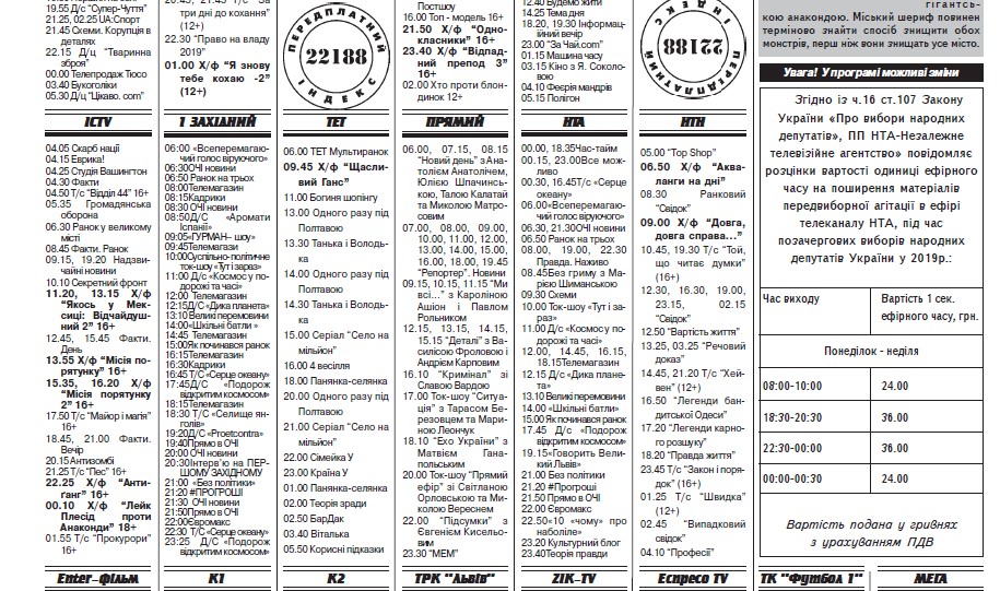 Згідно з оприлюдненою інформацією та отриманими відповідями на запити ОПОРИ, секунда політичної реклами на телеканалі «Перший Західний» коштуватиме від 24,00 до 36,00 гривень залежно від часу трансляції. Розмістити рекламний ролик на каналі «НТА» вартуватиме від 24 до 36 гривень за секунду, в ефірі ТРК «Міст» - з 00:00 до 18:00 - 250 гривень, з 18:00 до 24:00 – 300 гривень за секунду, а на «UA: Львів» - 2,63 гривні за секунду.