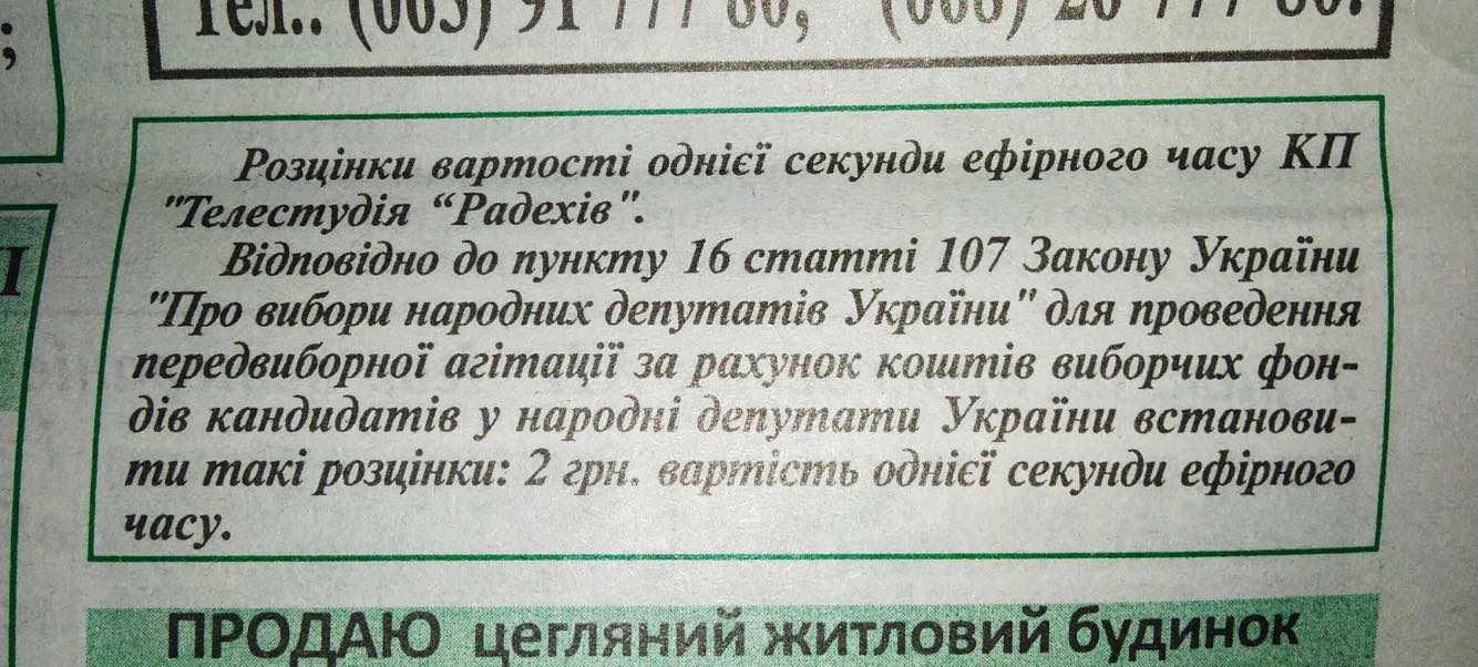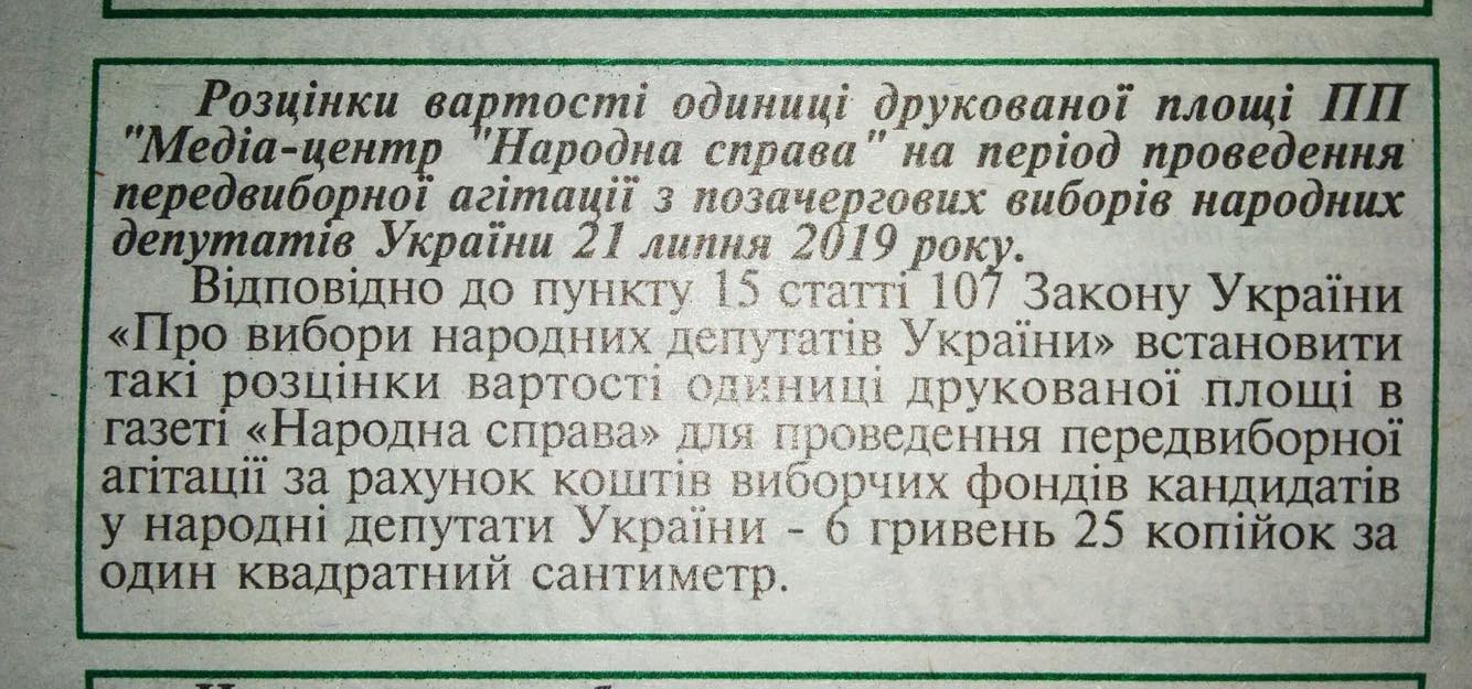 «Важливо розуміти, що згідно частин 15-17 статті 107 Закону це - обов'язок, а не право ЗМІ у виборчому процесі, не залежно від їхньої форми власності, якщо вони планують розміщувати у себе матеріали передвиборчої агітації. Згідно частини 6 статті 71 розмір одиниці друкованої площі та одиниці ефірного часу не може перевищувати розмір середньоарифметичного значення ціни за комерційну рекламу за останні три квартали року, що передують року проведення виборів депутата (квітень - грудень 2018 року).
