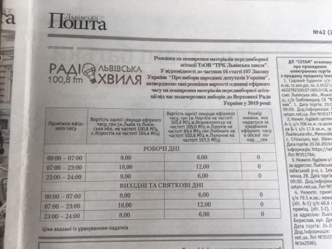 Низка львівських медіа оприлюднили із запізненням інформацію про вартість розміщення у них передвиборної агітації на час виборчого процесу. Деякі ЗМІ взагалі не опублікували такі оголошення. Спостерігачі Громадянської мережі ОПОРА дослідили, скільки грошей доведеться викласти партіям та кандидатам за агітацію в медіа.