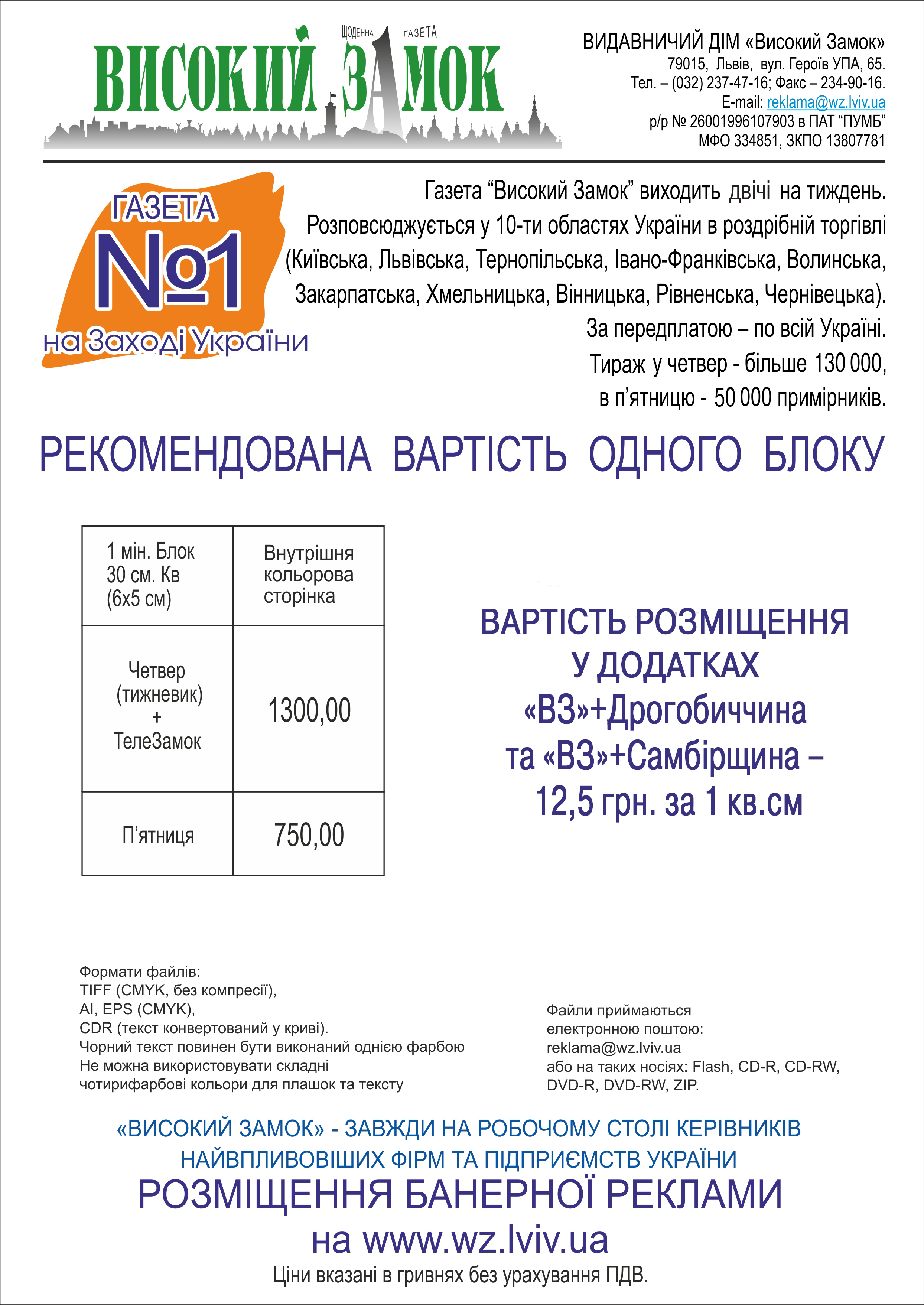 У газеті «Високий замок» розміщення мінімального рекламного блоку (30 кв. см.) вартуватиме 1300 гривень у четвер та 750 гривень у п'ятницю. Вартість 1 кв. см. політичної реклами у додатках («ВЗ»+Дрогобиччина, «ВЗ»+Самбірщина) становить 12,5 гривень. За один 1 кв. см. політичної реклами на кольорових сторінках газети «Львівська пошта» рекламодавець заплатить від 19 до 22 гривень, від 26 до 19 гривень відповідно на чорно-білих аркушах.