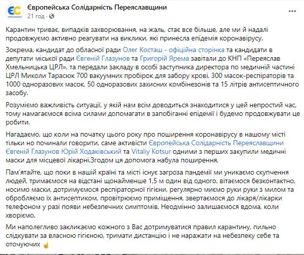 Також на сторінці «Європейська Солідарність Переяславщини» було зазначено – саме представники цієї політсили були одними з перших, хто закупив медичні маски для місцевої лікарні, а вже по тому така допомога набула поширення.