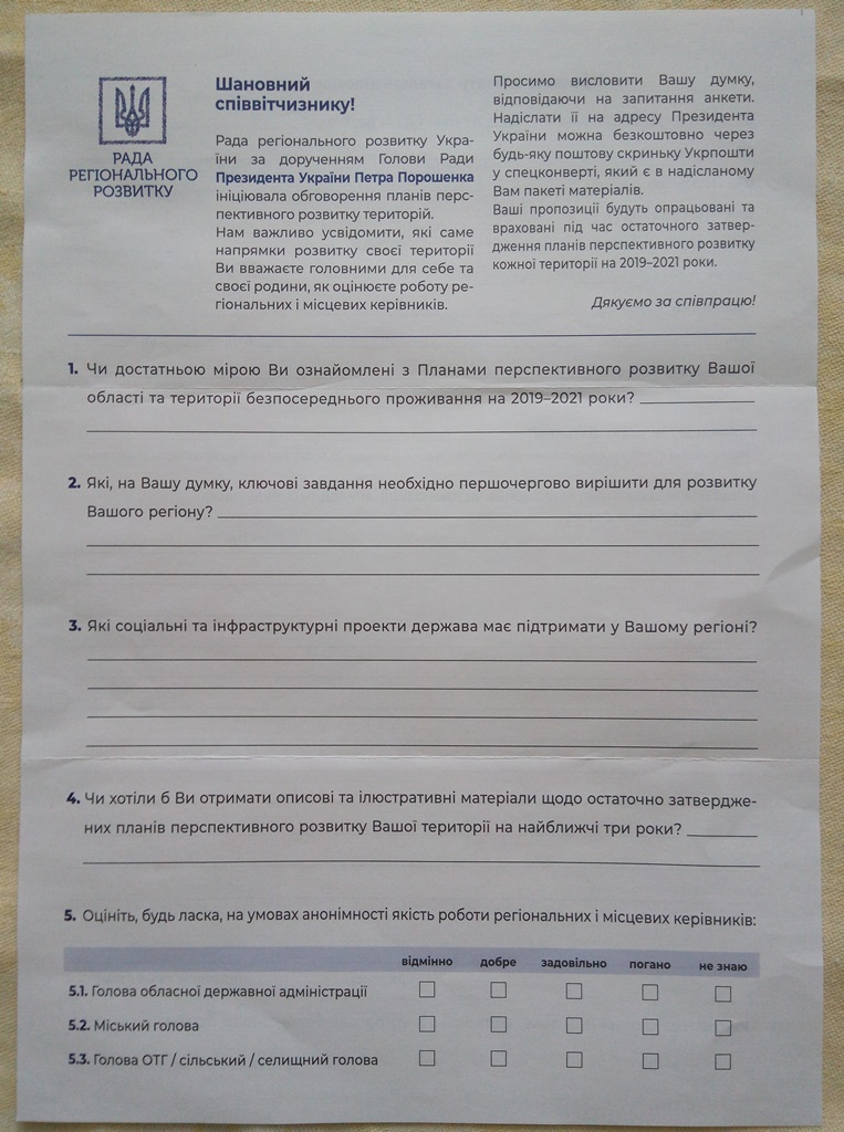 Окрім цього, у конверт вкладена анкета, на якій зазначено, що Рада регіонального розвитку України за дорученням Голови Ради Президента Петра Порошенка ініціювала обговорення планів перспективного розвитку територій. Далі респонденту пропонується дати відповіді на декілька питання, що стосуються його обізнаності в майбутніх планах, а також з пропозицією висловити свою думку про пріоритетні проекти. Поза тим, в анкеті є можливість оцінити роботу місцевих керівників: голови ОДА, міського голови та голови ОТГ чи сільського чи селищного голови.