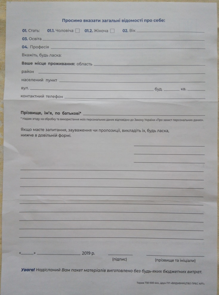Ця анкета також передбачає внесення наступних відомостей: стать, вік, освіта, професія, адреса. А у графі, де пропонується написати прізвище, ім’я та по батькові, вказано, що цим особа засвідчує згоду на обробку та використання своїх персональних даних відповідно до Закону України «Про захист персональних даних». Окрім цього, в кінці анкети вказано, що надісланий пакет матеріалів виготовлено без будь-яких бюджетних витрат. А тираж анкети – 730 тисяч примірників.